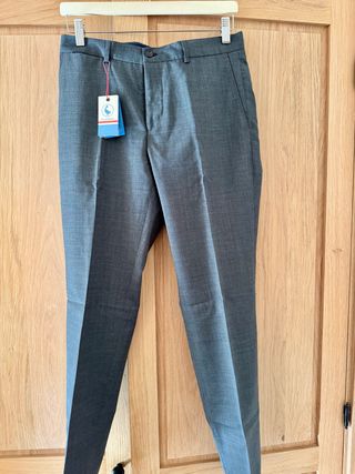 Pantalón de vestir de corte slim fit, de lana fría, ideal para un look elegante. Aún conserva sus etiquetas originales. con botones para usar tirantes