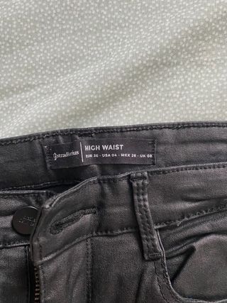 Pantalones negros de imitación piel, talla XS (34/6). Son de tiro alto . - Están en buen estado. - La tela tiene un brillo sutil.