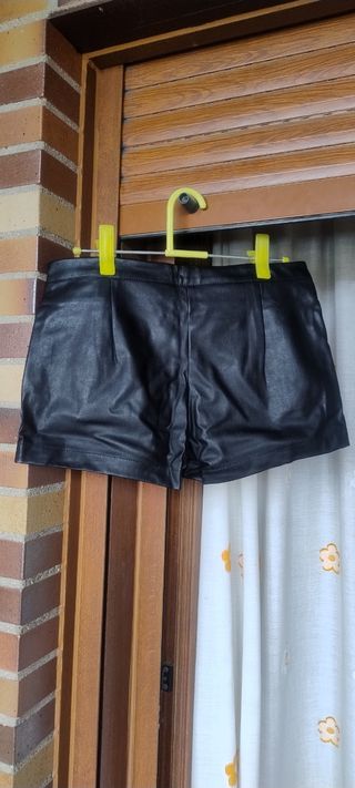 Pantalones cortos de cuero sintético de la marca Naf Naf. Aterciopelado por dentro, muy suaves y cómodos. Están arrugados en la foto porque llevan mucho tiempo guardados, me los puse sólo una vez - Tienen bolsillos con cremallera (decoración)