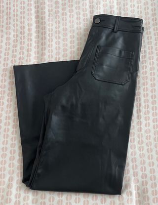 Pantalones de cuero sintético (poliuretano) de Zara, color negro. - Corte acampanado. - Cierre con botón y cremallera. - Bolsillos funcionales.