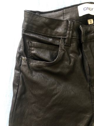 Pantalón pitillo con acabado efecto piel. - Diseño ajustado. - Cintura con trabillas para cinturón. - Cierre de cremallera y botón.