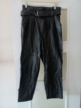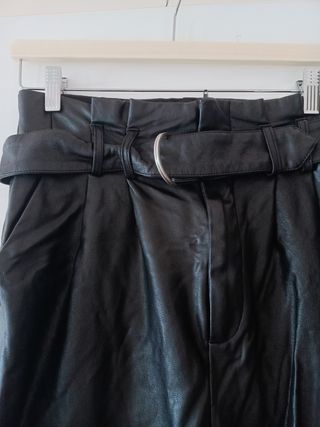 Pantalones negros de polipiel de Stradivarius. Son elegantes y cómodos. -Talla 38 - Corte cropped - Cintura alta con cinturón - Está un poco descosido en la parte trasera del cinturón de ahí el precio como se ve en la cuarta foto (se puede arreglar)