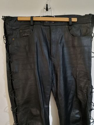 Pantalones de cuero para moto, con un diseño único gracias a sus cordones laterales. Color negro, nuevos sin etiqueta. Medidas: Cintura - 56cm Tiro - 36cm Largo - 110cm