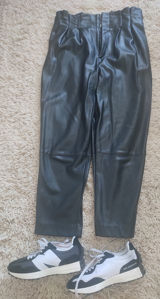 Pantalones de cuero sintético con un diseño moderno y cómodo. - Cintura elástica. - Cierre de cremallera y botones. - Bolsillos laterales. - Puños ajustados. -un poco rozado en la entrepierna