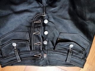 Pantalones acampanados de polipiel. Son negros con pespunte en hilo blanco y tienen un diseño elegante. - Cierre de botones. - Bolsillos funcionales. - Acabados impecables.en la foto se ve un rasgado al lado de los botones.
