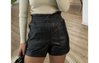 Shorts de ecopiel en color negro, con cintura elástica fruncida y cierre de dos botones y cremallera. Diseño de cintura alta. Bolsillos delanteros y traseros. Tienda leif store. Un único uso, como nuevos.