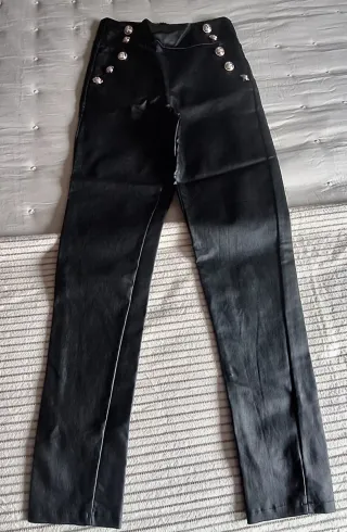 Pantalón de efecto piel con un diseño moderno y elegante. -Cierre con cremallera en la parte trasera - Efecto piel. - Detalle de botones plateados en la parte delantera. - Corte ajustado. Muy elastico -Usado un rato