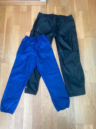 Pack de dos pantalones de esquiar, uno negro y otro azul. Perfectos para tus días en la nieve. - El primer pantalón es de talla L/XL y el segundo pantalón es para niños, talla 12 años (1,43-1,52cm) - Cintura elástica con cordón ajustable. - Tejido impermeable y cortavientos.