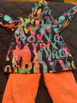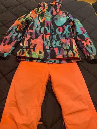 Conjunto de esquí Roxy que incluye cazadora y pantalón. - Cazadora multicolor con estampado de letras. Talla s - Pantalón de color naranja. Talla S ( algun corte de esqui en los bajos).
