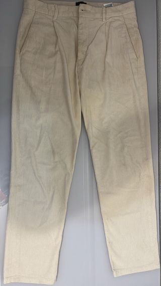 Pantalón de pana en color beige de la marca H&M. Un básico versátil para tu armario. - Tejido de pana con canalé fino. - Cintura con trabillas para cinturón. - Bolsillos laterales. - Cierre de cremallera y botón.
