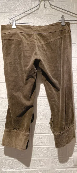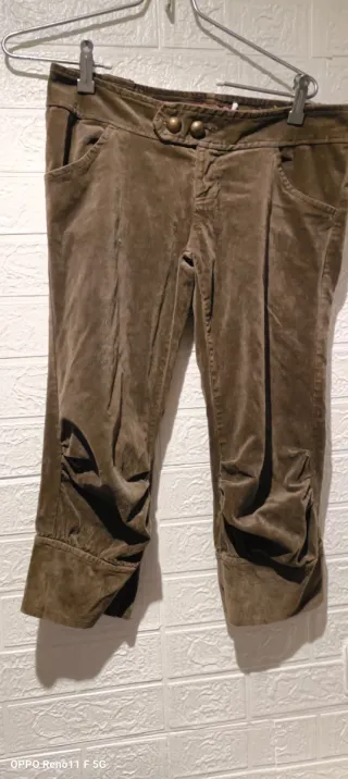 Pantalones capri de pana en color marrón. Tienen un diseño moderno y cómodo. - Tejido de pana suave. - Cintura con doble botón. - Bolsillos delanteros. - Detalle fruncido en los bajos.mide de cintura 40 ctms por 1,50 más cositas en mi perfil muy bien de precio Hago envíos