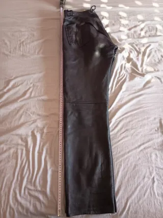 Conjunto de cazadora y pantalón de piel auténtica. - Cazadora estilo motera. - Pantalón a juego. - Cinturón con hebilla. Medidas aproximadas de la cazadora, 45 cm ancho de hombros,largo 42 cm. Tiene dos bolsillos en la parte delantera. Medidas aproximadas del pantalón cintura 60 cm,largo desde la cintura 93 cm. Tiene cuatro bolsillos, dos en la parte delantera y dos en la parte de atrás.