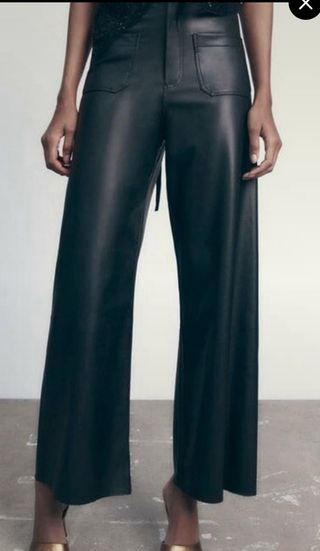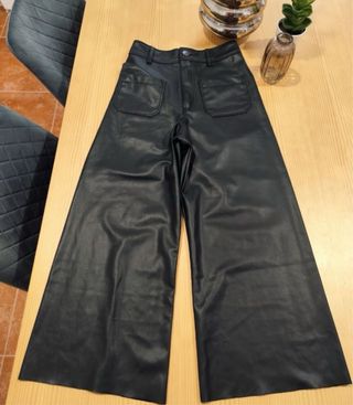 Pantalón de efecto piel de Zara. - Diseño de pierna ancha. - Cintura alta. - Cierre de cremallera y botón.