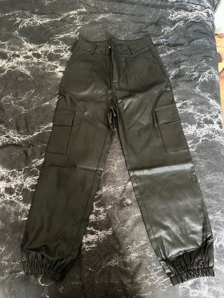Pantalón cargo de efecto piel en color negro. Diseño moderno y versátil. Es una XS, pero viene grande. - Bolsillos cargo en los laterales. - Cintura con trabillas para cinturón. - Puños elásticos en los tobillos. Medidas: - Cintura: 64cm - Caderas: 88cm - Largo: 94cm - Muslo: 54,5cm