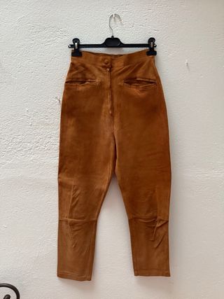 Pantalón de ante de color marrón. Fabricado en el pueblo de Ubrique, pueblo dedicado a la fabricación de prendas y artículos de piel. - Diseño de talle alto. - Bolsillos delanteros. - Cierre de botón y cremallera. - Detalle de costuras en las rodillas. - Talla XS - Esta en perfecto estado, ningún signo de desgaste