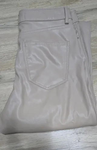 Pantalón de Zara con un acabado que imita la piel. - Diseño de corte recto. - Cintura con trabillas para cinturón. - Bolsillos traseros. - Cierre de cremallera y botón. - El interior del pantalón va super bien forrado efecto una piel de melocotón lo que lo hace muy agradable y fácil de poner buena calidad en costuras.