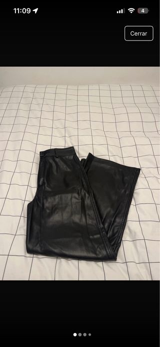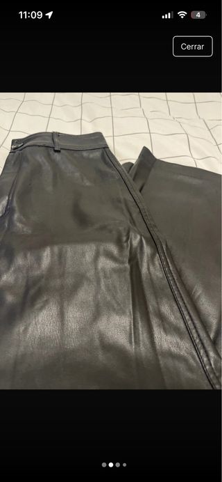 Pantalones de efecto piel de Zara. - Corte ancho. - Cierre de cremallera y botón. - Bolsillos delanteros y traseros.
