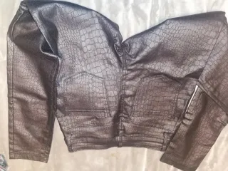 Pantalón de efecto piel con un diseño moderno y detalles de cremalleras. - Efecto piel. - Cremalleras decorativas y funcionales. - Corte ajustado. Le quedaba pequeño de talla y nunca se utilizó
