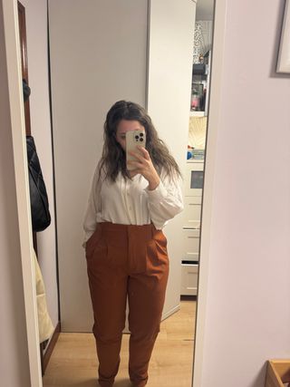 Pantalón chino color topo. - Pinzas delanteras. - Cierre de cremallera y botón. - Bolsillos laterales. Puesto una vez sólo.