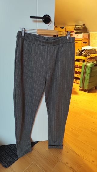 Pantalón de pinzas para mujer, en color gris, de Lefties. Está en buen estado. - Diseño de pinzas. - Muy cómodo - Corte recto. - Goma en la cintura.