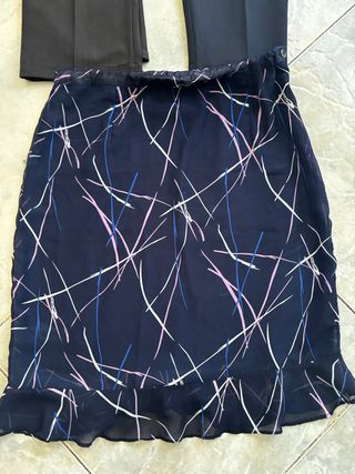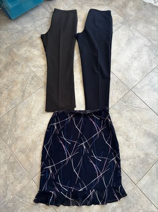 Conjunto de dos pantalones de pinza y una falda. - Pantalones de color gris oscuro casi negro. - Pantalones de color azul marino. - Falda estampada con líneas finas en varios colores y volantes en el bajo, con forro interior.