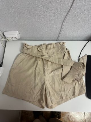 Pantalón corto de tela color beige con cinturón a juego. - Cintura elástica con detalle fruncido. - Incluye cinturón de tela. - Bolsillos laterales.
