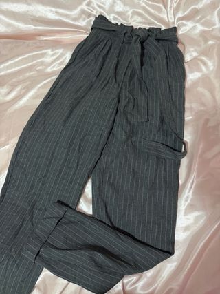 Pantalones de vestir grises con un diseño clásico de raya diplomática. Cuentan con un cinturón a juego para un ajuste personalizado. - Cintura con fruncido y lazo. - Raya diplomática vertical.