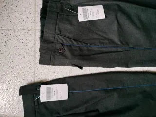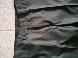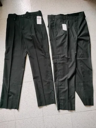 Pantalónes de vestir gris con raya azul, ideal para uniformes de servicio. Talla 44. - Diseño clásico con raya lateral. - Cierre de botón y cremallera. - 10€ los dos juntos. - 6€ uno suelto.