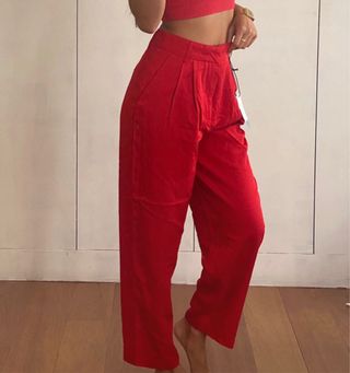 Pantalón de vestir de color rojo, con un corte ancho y moderno. - Cintura alta. - Pinzas delanteras. - Bolsillos laterales. - Nuevo