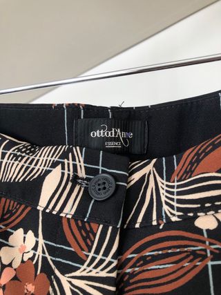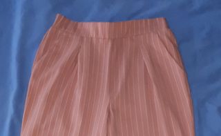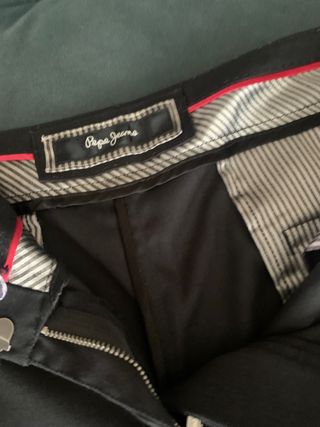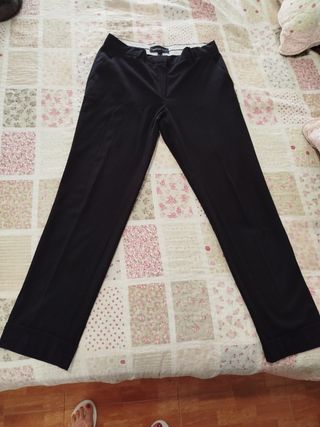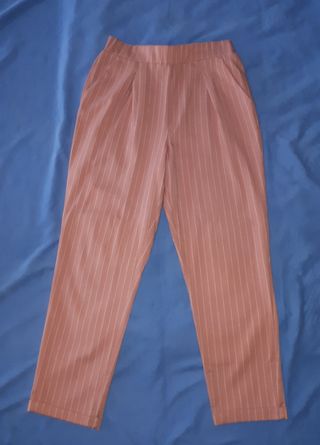 Pantalón talla M, con rayas blancas, cintura elástica y pinzas en la parte delantera. Se le ha dado poco uso, por lo que está en muy buen estado. 63% poliéster/35% viscosa/2% elastano.