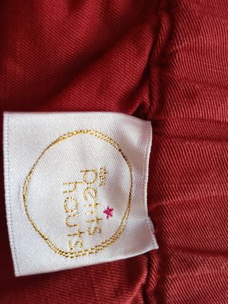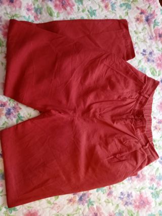 Pantalón des petits hauts, de verano. Creación francesa. Algodón color rojo anaranjado, tipo teja. Con goma trasera en la cintura, pinzas delanteras y bolsillos laterales. Corte recto. Muy poco usada. Talla francesa T1, que equivaldría a una M tirando a pequeña. Muy poco usado y muy bien cuidado. Sólo envíos.