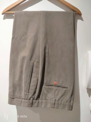 Impecable pantalón de pinzas de la marca catalana PEYTON. De la talla 52 y color, a mi entender, entre caqui y marrón. Medidas de cintura 52 cm y de largo desde cintura 94 cm.