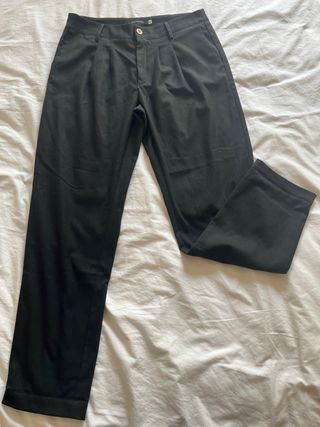 Estilo: Elegante y moderno, con detalle original en ambas perneras. Diseño: Negro clásico, con abertura desde el entalle de la cintura que se abre en ambas perneras al andar; según cómo se dé el paso, la apertura se ajusta, aportando un toque atrevido y contemporáneo. Ajuste: Cintura estándar, cómodo y versátil. Uso: Casi nuevo, comprado para una ocasión especial y apenas usado. Estado: Perfectísimo. Talla: M. Ideal para quienes buscan un pantalón formal con un detalle distintivo y dinámico.