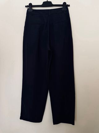 Pantalón azul marino de corte recto con pinzas delanteras. Es de Lefties. Medidas: cintura 70cm, cadera 108cm, largo 94cm, ancho de bajo 21cm. Tallado como 34, pero da para 36/38, revisar medidas.