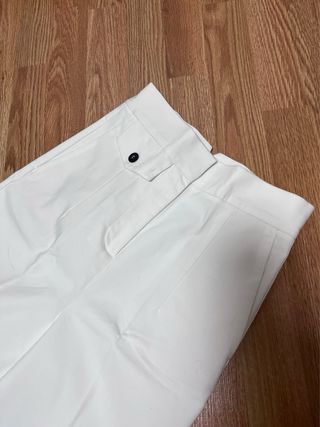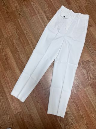Pantalón de pinza blanco. Es un muy buena opción para personas delgadas. Es de cintura alta y tallan como si fuesen XXS(32). Los he usado una vez y los he llevado al costurero para cortarlos de largo y que queden de corte tobillero. Mido 158cm.