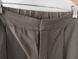 Corte: Recto y clásico, con pliegues (pinzas) discretos en la parte delantera y trasera. Cintura: Talle alto o medio-alto. Cierre con cremallera (marrón verdoso oscuro, como se ve en la foto) y botón. Detalles: Presillas para cinturón. Acabado de tela liso con una ligera textura visible. Comodidad: Tejido con buena caída, muy fresco y cómodo.