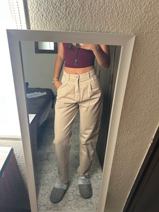 Pantalones rectos en color beige, muy cómodos y versátiles. Tienen pinzas delanteras que estilizan la figura y varios bolsillos tipo cargo que les dan un toque moderno. Tejido suave y ligero, ideal para el día a día. Quedan súper bien combinados con tops o sudaderas. En muy buen estado, sin manchas ni roces. Precio negociable!!
