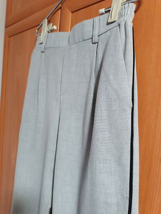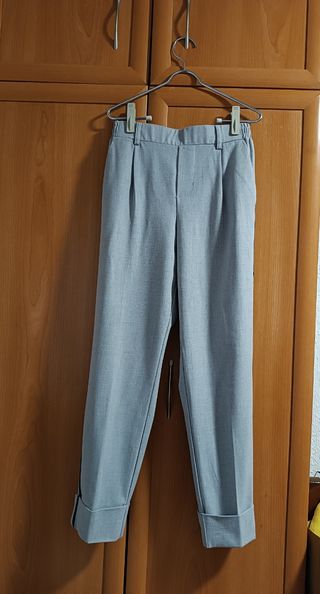 Pantalón de vestir gris con un diseño moderno, tiro alto, cinturilla elástica en parte trasera, dobladillo con vueltas. Muy bueno. Bershka. Talla S