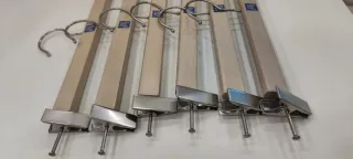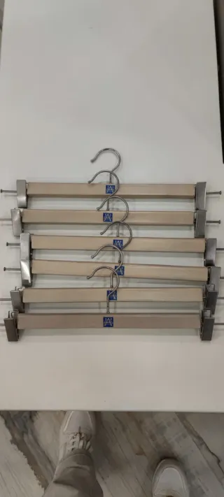 50 perchas de madera con pinzas ajustables, ideales para colgar faldas, vestidos y pantalones. - Diseño de madera clara. - Pinzas metálicas plateadas. - Gancho giratorio plateado.