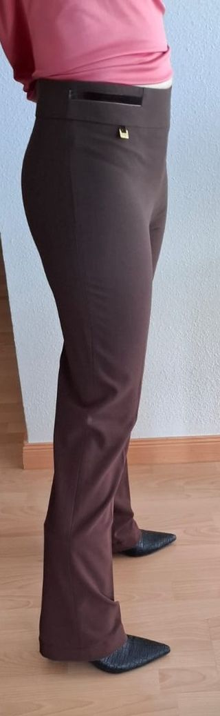 Pantalón de vestir de corte recto. Caída fluida. Ribetes delanteros en terciopelo. Muy elegantes para ir a trabajar. - Color marrón chocolate. - Detalle metálico dorado en la cintura.
