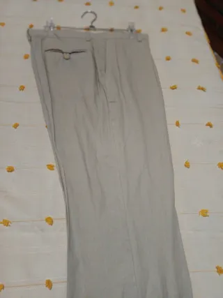 Pantalón de corte recto, pinzas , bolsillos laterales y traseros. Talla M amplia Tela algodón y lino color.crema Cintura 39 Largo 105 Sientan muy bien