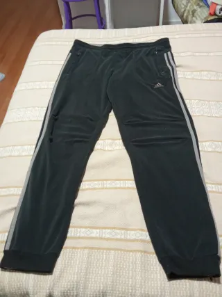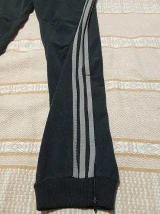 Pantalón de chándal con el diseño clásico de tres rayas. - Cremallera en el tobillo. - las cremalleras del tobillo se abre por si quieres llevarlo ancho. - en la zona de las rodillas lleva los laterales dos pequeñas pinzas. - dos bolsillos laterales con cremallera en la parte delantera. - ajuste de la cintura con cordón - bolsillo trasero con cierre de clip. - la tela es de felpa, muy calentito. - en la zona de la rodilla delantera tiene una pequeña manchita de pegamento, apenas visible y el logotipo de adidas el cosido un poco movido. (Se ve en la foto penúltima e última). - la talla D5F174, corresponde a talla 4XL española
