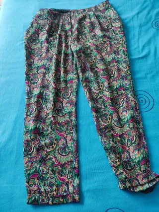 Pantalón de mujer con un llamativo estampado. - Diseño con motivos florales y paisley. - Cómodo y elegante. - Tejido ligero y fluido.