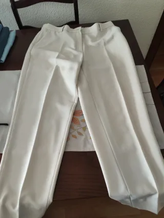 Pantalón estampado con fondo blanco. Sin cinturilla. Bolsillos laterales y de ojal falso por detrás. Es de Zara pero no tiene etiquetas de marca, talla ni composición. Medidas en fotos, cualquier duda consultar antes de comprar.