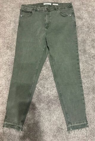 Pantalón vaquero elástico en color verde, talla 44. Corte moderno y cómodo. - Cintura alta. - Bolsillos delanteros y traseros. - Bajo deshilachado con detalle de cremallera.