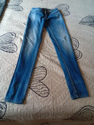 Pantalones tejanos estilo Super Skinny en buen estado. - Diseño desgastado con rotos. - Corte ajustado. - Cierre de botón y cremallera.