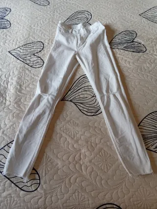 Pantalones vaqueros pitillo de color blanco. Son de tiro medio y corte ajustado. - Están en buen estado. - Ideales para un look casual y elegante,5 bolsillos