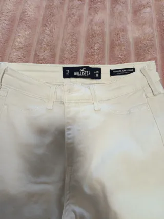 Pantalón de tela de la marca Hollister en color beige. - Diseño clásico. - Cintura con trabillas para cinturón. - Cierre de cremallera y botón.