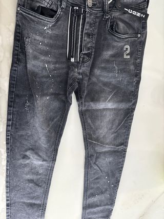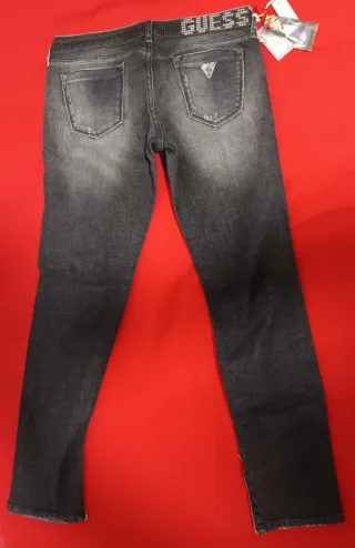 Pantalones vaqueros negros con un diseño único. La talla es la 34 pero una 36 también se la puede poner. - Detalle de pedrería en los bajos. - Adorno de encaje en el bolsillo delantero.