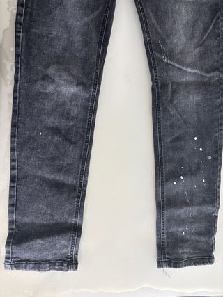 Pantalón vaquero de la marca ZARA con un diseño único. - Color base negro con salpicaduras multicolor. - Estilo desgastado con rotos.